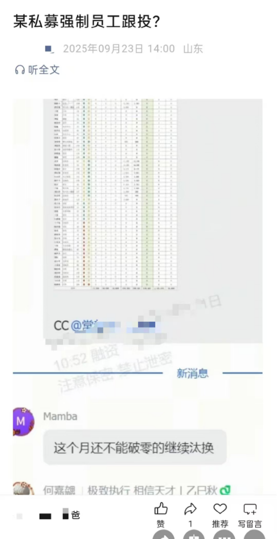 近期,围绕某觅基金的一份疑似内部文件截图引发市场热议。网传内容显示,该基金在员工层面设置了“强制跟投绑定淘汰机制”,并通过委托代持的方式绕开合格投资者认定,引发外界对其操作模式的关注。