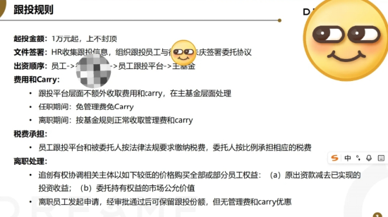 在 *** 传播的图片中,背景水印印有“DREAME”字样。文件显示,起投金额为1万元起,上不封顶;费用及Carry层面,跟投平台不额外收取费用和Carry,处理环节放在主基金层面;任职期间免管理费和Carry,离职后则按基金规则正常收取。文件还提到,HR将收集员工跟投信息,并组织员工与**庆签署委托协议。