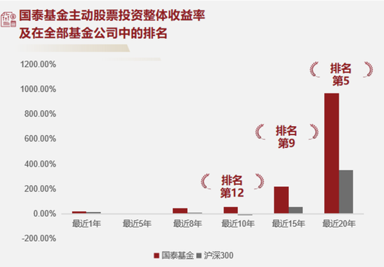 数据来源:银河证券《主动股票投资管理能力评价•长期评价榜单(指数法+广义口径)》,数据截止日期:2025年6月30日。最近5年-最近20年国泰基金主动股票投资管理收益率,沪深300,同类排名分别为:-0.62%,-5.47%,51/95;55.09%,2.89%,27/86;44.13%,12.11%,45/75;42.44%,7.34%,42/73;68.65%,24.80%,17/70;51.61%,-12.00%,12/66;169.06%,81.80%,14/61;192.37%,78.86%,12/61;216.32%,59.90%,8/61;173.07%,29.30%,6/59;219.81%,53.57%,9/59;208.32%,24.30%,9/59;272.96%,40.99%,5/57;210.29%,4.57%,7/53;550.37%,182.37%,6/35;969.01%,347.95%,5/29。我国基金运作时间较短,过往业绩不代表未来表现。