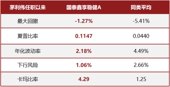 从其他风险控制指标来看,自基金经理茅利伟自2023年7月5日开始管理任职以来,基金的夏普比率(代表风险调整后的收益)、年化波动率、下行风险、卡玛比率等指标,也显著优于同类基金平均水平,展现出强大的风险控制能力。