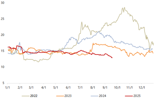 现货超预期弱势下,期货重心下移,近月跟随现货下跌后,远月高升水合约出现补跌行情。从估值角度来看,目前现货已经跌至完全成本以下(12.5元/kg),后续能否跌破现金流成本未知(11.5元/kg),中远期合约12500附近或有较强支撑,但趋势性上涨目前还缺乏强劲动力。四季度供应压力仍偏大预期下,近月跟随现货表现偏弱为主,远月合约目前虽升水现货,但当前估值下大幅下跌空间有限,且若中间出现黑天鹅事件,风险与收益率不成正比,盘面格局偏反套。