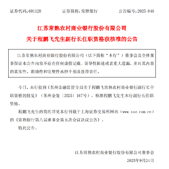 9月24日金融一线消息,江苏常熟农村商业银行发布公告称,今日,本行收到《苏州金融监管分局关于程鹏飞常熟农村商业银行副行长任职资格的批复》(苏州金复〔2025〕167号),核准程鹏飞先生本行副行长任职资格。