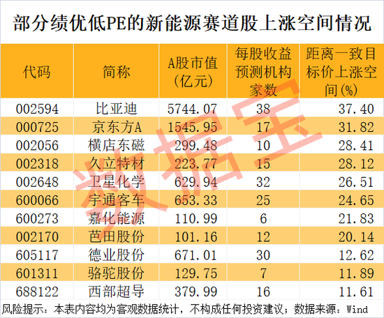 在不少机构看来,部分绩优低估值的新能源赛道股仍有溢价空间。根据5家以上机构一致预测,9月24日收盘价与一致预测目标价相比,、、横店东磁、久立特材、卫星化学等11股上涨空间均超11%。
