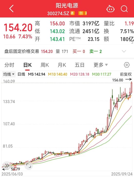 今日(9月24日),阳光电源(300274)盘中涨超8.6%,收盘上涨7.43%,最新收盘价创历史新高,A股市值突破3000亿元。该公司为光伏逆变器和储能双料龙头之一,2025年上半年公司实现营业总收入435亿元,同比增长40.34%;实现净利润77.35亿元,同比增长55.97%。与过往对比,公司营收和净利润均创同期历史新高。
