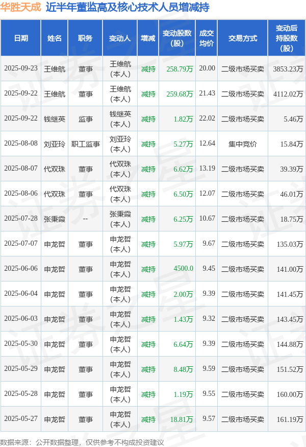 华胜天成近半年内的董监高及核心技术人员增减持详情如下: