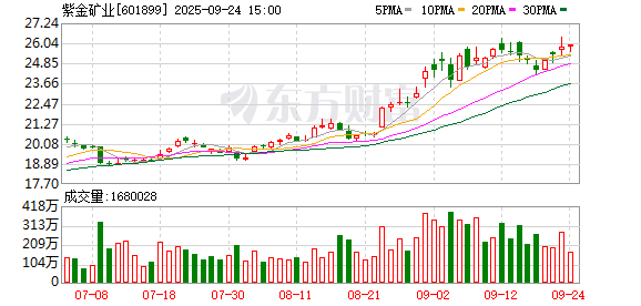 证券时报·数据宝统计显示,紫金矿业今日收盘价为25.93元,上涨0.43%,日换手率为0.82%,成交额为43.24亿元,全天主力资金净流入466.41万元,近5日该股累计上涨3.43%,近5日资金合计净流出7.70亿元。