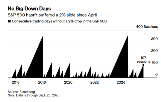 这一美国股市基准指数已连续107个交易日未出现至少2%的跌幅,为2024年7月以来最长纪录。彭博汇编的数据显示,即便是四月初的关税风波,市场也未放在心上。该指数自那之后累计飙升34%,市值增加近16万亿美元。