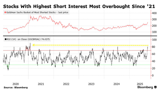 目前,高盛“最被做空股票篮子”的14日相对强弱指数(RSI)已升至2021年初“迷因股狂热”高峰以来的更高超买水平——当时散户交易者曾推动股票出现莫名的剧烈波动。通常而言,此类超买水平意味着回调即将来临。