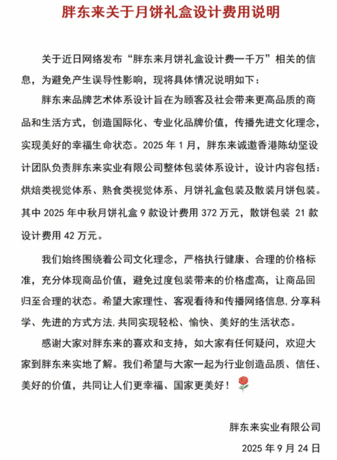胖东来9月24日晚间发布声明称,今年1月,胖东来邀请香港陈幼坚设计团队负责胖东来实业有限公司整体包装体系设计,设计内容包括:烘焙类视觉体系、熟食类视觉体系、月饼礼盒包装及散装月饼包装。其中,2025年中秋月饼礼盒9款设计费用372万元,散饼包装21款设计费用42万元。其设计总花费为414万元。