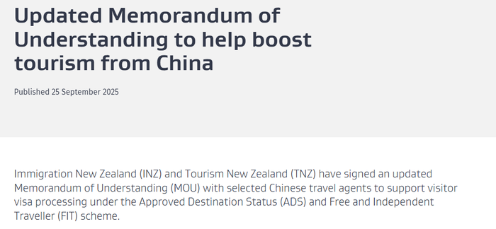 新西兰移民局9月25日发布声明称,新西兰已同部分中国旅行社签署最新谅解备忘录,将“被批准的旅游目的地国家”(ADS)和“自由行旅客”(FIT)计划下的旅游签证办理周期从10天缩短至5天。
