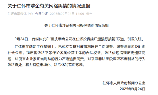 9月24日,仁怀市人民 *** 新闻办公室发布“关于仁怀市涉企有关 *** 舆情的情况通报”: