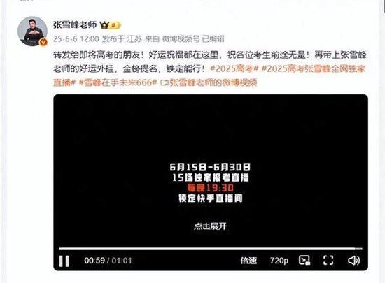 不过,在6月6日,张雪峰在微博发布视频祝各位考生金榜题名,并宣布6月15日-6月30日将在快手连开15场独家直播连麦。而从他宣布停播再到宣布“撤回”这一决定仅不到一周。