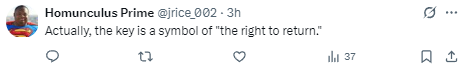 还有网友在线“科普”,“实际上,这把钥匙象征着‘回归的权利’。”“唯一危险的是你们的占领行为。钥匙代表着回家。”↓