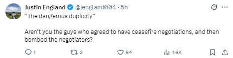 也有网友对以外交部帖文中提到的“危险的欺骗行为”表示质疑,“‘危险的欺骗行为’。你们不就是那些同意进行停火谈判,然后又去轰炸谈判者的人吗?”↓