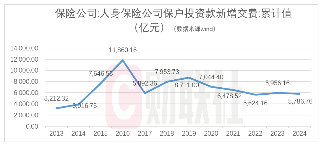 2024年,代表万能险保费的“保户投资款新增交费”为5787亿元,同比下降约3%。