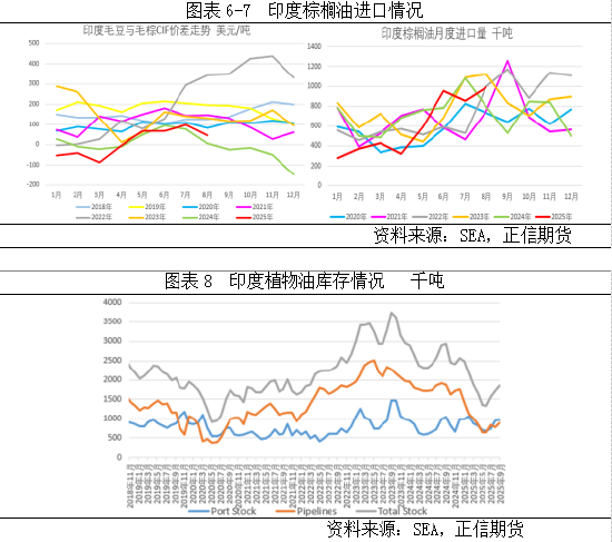印度补库预期落地。2025年2季度印度进口毛豆棕CIF价差结束长达8个月的倒挂,且国内植物油库存降至低位,补库需求紧迫;自2季度以来,市场普遍看好印度补库,也把该预期作为交易棕榈油的重要逻辑之一。当然,印度棕榈油进口自4月开始回升,6-8月连续3个月超85万吨;不过同期印度国内消费旺盛,6月超130万吨,8月高达150万吨,需求大增令其库存重建速度缓慢,截止9月初印度植物油库存187万吨,环比仅增15万吨,但同比大降106万吨。印度将迎来10月下旬的排灯节,补库需求依然存在,预计9月棕榈油进口量维持高位,本轮价格下跌,中印均逢低买货。