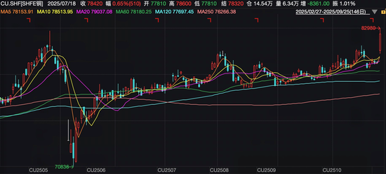 今日行情:今日跳空高开并大幅上涨,截至下午14:00,主力CU2511合约盘中一度接近83000元/吨,盘中更高价较昨日收盘价涨幅约3.78%。