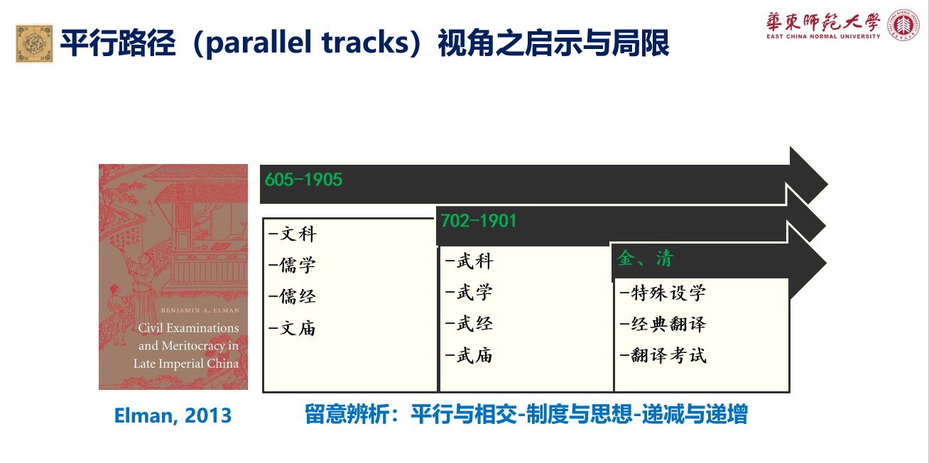 若以“系统序列”视角切入,考察科举制度之设计与运行,其中尚有平行与相交的复杂关系,值得留意。清代科举之常科,大类有三:曰文科,曰武科,曰翻译科。至于其中的整体架构,亦有可再稍加辨析者。艾尔曼教授著Civil Examinations and Meritocracy in Late Imperial China(Harvard University Press, 2013;中译本见刘倩译:《晚期 *** 的科举与选士》,香港中华书局,2022年)。案:此书实为上述《科举文化史》一书之缩略版,因此两书之中英版本皆可“相观而善”。其引言内将文、武科举称为“平行路径”(parallel tracks),此说有其启示意义。诚然,在作为主线、主体和主流的文科考试之外,尚有其他常规考试系统并存;尤其是文科-武科、儒学-武学、儒经-武经、文庙-武庙的对应存在,确实颇有“平行”之义。