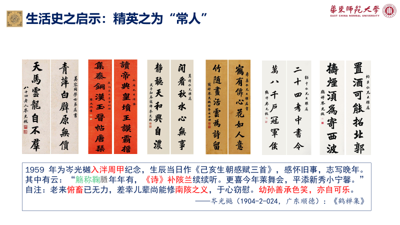 循着“认同”和“意义”这些内在线索,加之笔者近年任教及研究“日常生活史”零星所得,更增一层菁英之为“常人”的体察。笔者起初主要仍以“幸运的佼佼者”视角,理解和论析此一群体。诚然,在诸如功名、学识、职位、地位等“社会区分”的指标上,他们都可归入菁英群体。但回归至人之为“人”的基本身心与情感层面,他们仍为凡人。兹举数例,以窥一斑。