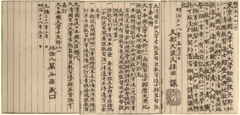 光绪三十一年(1905)进士馆延聘矢野仁一之聘约局部(日本国立公文书馆藏)