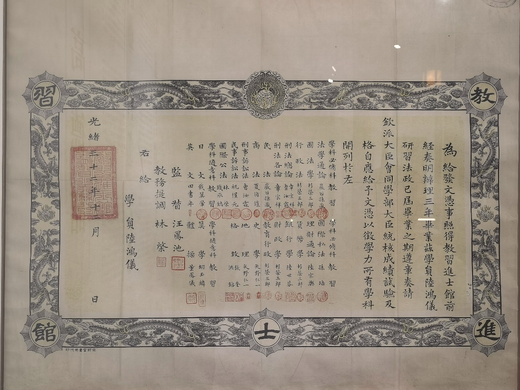 陆鸿仪(1903-2-029,江苏元和)所获进士馆修业文凭(笔者摄于苏州状元文化博物馆)