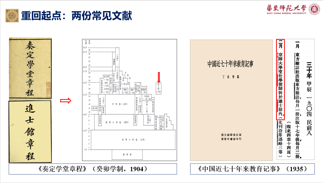 引发笔者关注此题的原初“触点”之一,是在多种史料汇编和学术著作中常见的“癸卯学制系统图”。此图常见多个呈现版本,不仅详略程度未尽一致,而且层级结构也有不同。在较为精审准确的版本图示中,可以看到一个孤悬于外的独特机构——进士馆。这不禁令人生疑:“进士馆”是为何物?此图既然称为“学制系统”,理当衔接一贯,为何还有此种“飘散”成分?原初“触点”之二,是丁致聘编:《中国近七十年来教育记事》(国立编译馆,1935年),其中光绪三十年甲辰(1904)二月条载:“京师大学堂仕学馆归并于进士馆内”(13页)。这条记载同样引人疑问:“仕学馆”又是何物?为何将其归并于进士馆?此事有何特别意义,以至能在这份简要的教育编年文献之中,独占二月之条?