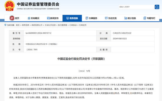 2024年8月16日, *** 披露了一份处罚决定书,天职国际会计师事务所(特殊普通合伙)被 *** 罚没超2700万元,同时还被暂停从事证券服务业务6个月。