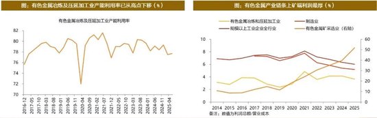 横向对比其他行业,目前有色采选及冶炼PPI位于正值区间,产能利用率高于汽车、煤炭等行业,因此改革的急迫性稍弱。然而若以时间轴纵向比对,无论是有色冶炼和压延加工还是采矿业,行业PPI和产能利用率均已过高点且处于缓慢下行通道,提前预防的重要性渐显。2025年7月18日,工信部在国新办发布会中提到实施新一轮钢铁、有色金属、石化、建材等十大重点行业稳增长工作方案,推动重点行业着力调结构、优供给、淘汰落后产能,具体工作方案将在近期陆续发布。