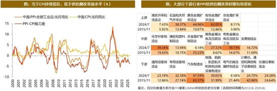 从分行业PPI来看,对比供给侧改革和“反内卷”提出两个时间节点,各行业PPI增速12MMA所处的历史分位数(选取时间周期为2013/8-2025/6),可知下 *** 业的恶化程度相对上 *** 业更为明显,例如汽车制造业、铁路等其他运输设备制造业、电气机械及器材制造业以及计算机、通信和其他电子设备制造业的PPI分位数均表现为下降。因此,“反内卷”率先聚焦于恶化程度明显的新能源汽车、光伏等需求端行业。