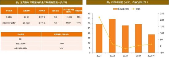 铜贡献主要毛利,玉龙铜矿潜力可期。25H1,公司矿产铜产量91,752吨,yoy+8%,冶炼铜产量182,249吨,yoy+50%。从毛利构成来看,2024年披露的铜类产品占比约为67%,为主要盈利支撑。未来铜版图有望进一步扩张,公司玉龙铜矿三期工程项目已于6月23日收到《*自治区发展和改革委员会关于*玉龙铜业股份有限公司玉龙铜矿三期工程项目核准的批复》,三期工程建成后玉龙生产规模将由1989万吨/年增加至3000万吨/年。