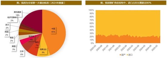 我国矿冶匹配明显不均。我国为全球之一大铜冶炼国,2024年贡献约45%的产量,然而前文提及我国铜矿储量和产量分别占全球4%和9%。