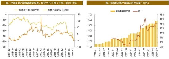 我国冶炼产能增速迅猛,加剧原料供需矛盾。冶炼厂的建设周期远小于矿山的建设时间,炼厂建设周期约18-24个月,然而新矿山的开发需要7-10年,时间的错位造成结构性矛盾。2025年国内铜冶炼厂产能大幅扩张,等企业存在扩张动作。据上海有色网统计,截至2025年7月,我国电解铜产能增速约为15%,几乎两倍于全球精铜产能增速(8%),冶炼产能的大斜率放量,将进一步催化我国冶炼厂争夺原料的局面。