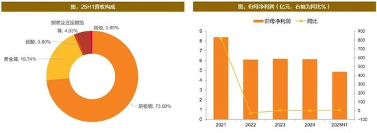 铜产品主导盈利,刚波夫矿冶产能有望齐增。25H1,公司自有矿山产阴极铜43,153吨,yoy-1%,公司阴极铜总产量为72,192吨,yoy+16%,自产粗铜及阳极铜42,053吨,yoy+17%,粗铜和阳极铜总产量为111,283吨,yoy-30%,粗铜及阳极铜、阴极铜收益占总收益的89.7%,主导公司盈利。刚波夫矿冶齐推进,西矿体项目预计于2028年投产,MSESA矿体于2024年完成资源量估算,正在进行可行性研究,湿法厂工艺系统整体优化项目于2024年8月获批,预计2025年建成投产。