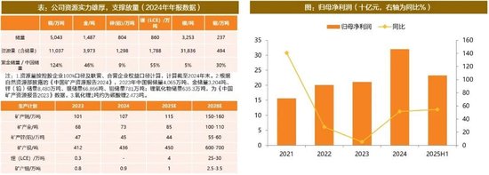 阴极铜为主要利润来源,公司高度重视找矿探矿。25H1,公司铜精矿含铜产量为2.79万吨,yoy-12%,阴极铜产量为77.94万吨,yoy+53.22%,阴极铜毛利占比为40%。公司持续加大资金投入开展各矿区地质综合研究、矿山深边部找探矿工作,目前主要拥有的普朗铜矿、大红山铜矿、羊拉铜矿等矿山,具有良好的成矿地质条件和进一步找矿潜力,助力资源实现增储上产。
