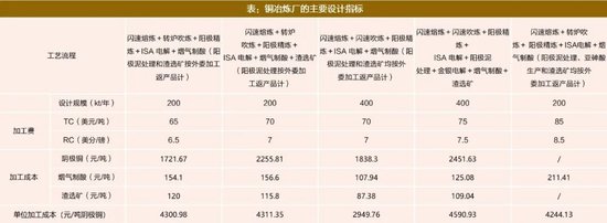 据《铜冶炼成本计算需关注的问题》(2013年),可得项目之间的单位加工成本存差异。另据中国有色金属报(2016年),对比三个相同规模、分别用双闪工艺、双底吹工艺、底吹熔炼-卧式顶吹吹炼工艺的铜冶炼项目的可研报告,底吹熔炼-卧式顶吹吹炼能耗、加工费更低,双闪更高,因双闪多了精矿干燥、铜锍粒化与干燥细磨、熔剂制备(石英、石灰石干燥磨矿)等工序。