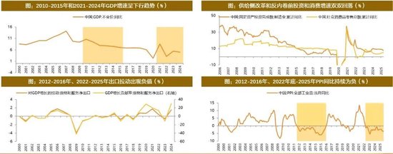 从CPI增速来看,对比2010-2015年和2021-2025年两个阶段,供给侧改革前CPI增速仍为正,而当下CPI同比围绕0值波动,显示上游原材料降价(两个阶段PPI均处于负值区间)未能有效 *** 需求,下游企业盈利难以改善,传导至投资意愿萎缩、经济增长放缓。