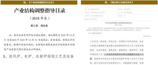 (1)《产业结构调整指导目录》(2019年修订),其中淘汰类:明确列出鼓风炉、反射炉、电炉等工艺,为国家产业政策已明令淘汰或立即淘汰。
