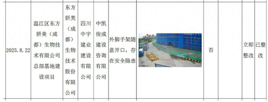 医疗企业的安全根基,在东方妍美身上出现了系统性松动。今年5月,成都市温江区住建局的消防安全排查通报揭开了其管理漏洞的冰山一角——东方妍美总部基地建设项目存在两项严重违规:焊工焊接作业无旁站人员,且未设置接火斗及灭火器,分别违反《建设工程安全生产管理条例》与《焊接与切割安全》国家标准。高温熔渣无防护、动火作业无监管的粗放管理,一旦引发火灾或坠落事故,不仅将延误工期,更会直接冲击其IPO资产估值。