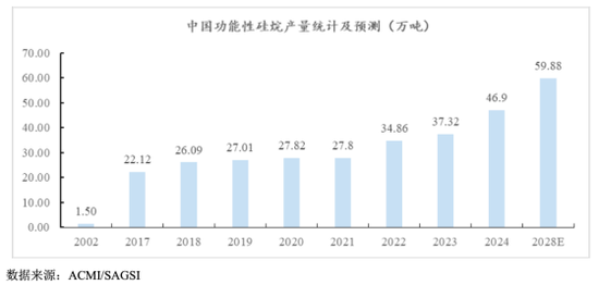 根据ACMI/SAGSI统计,全球功能性硅烷产量从2002年的10.30万吨增长至2024年的63.35万吨,2002年-2024年复合增长率为8.61%;预计到2028年全球功能性硅烷产量将达到71.9万吨,2024年-2028年复合增长率为3.22%。