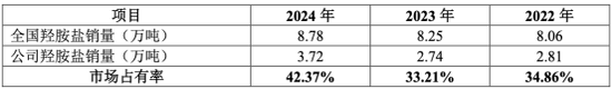 根据QY Research统计及预测并结合公司羟胺盐销量测算,2022年、2023年、2024年公司羟胺盐国内市场占有率分别为34.86%、33.21%和42.37%,市场占率领先态势显著且在稳步提升。