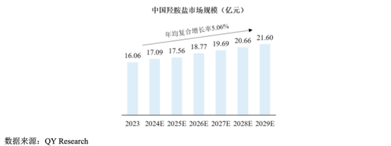 根据贝哲斯咨询预测,全球羟胺盐市场规模将由2023年的27.14亿元增长至2028年的31.79亿元,年均复合增长率为3.21%。根据咨询机构QYResearch数据,2023年羟胺盐国内市场规模约16.06亿元,预测2029年市场规模达到约21.60亿元,2023年-2029年市场规模复合增长率为5.06%。