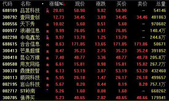 AI应用概念今日走势活跃,截至收盘,品茗科技20%涨停,涨近13%,天下秀、浪潮信息等亦涨停。