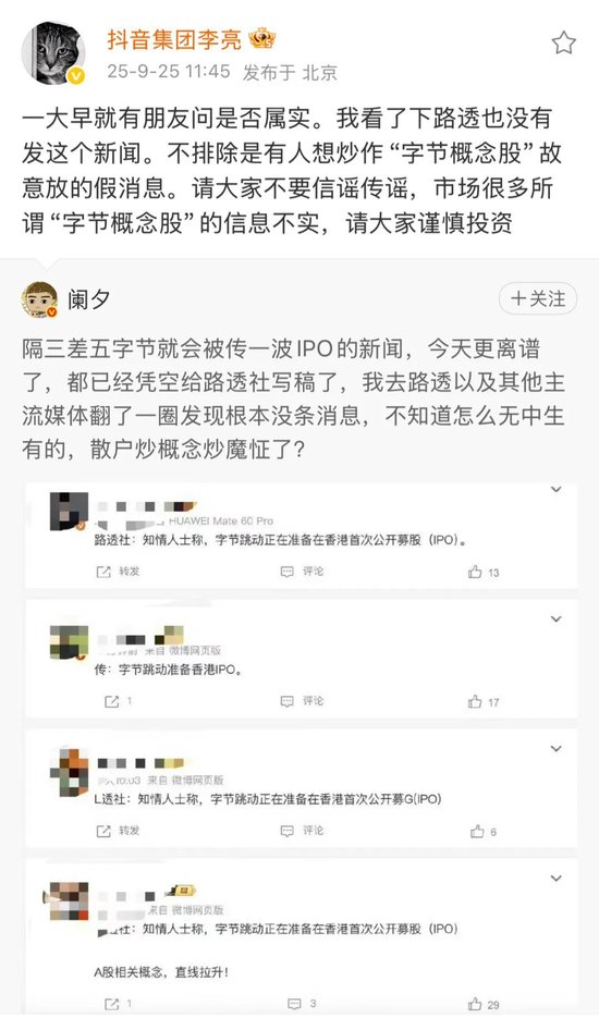 9月25日,抖音集团副总裁李亮针对关于字节跳动将在港股上市的传闻进行公开回应。李亮发文称,一大早就有朋友问(字节跳动港股上市)是否属实,看了下路透也没有发这个新闻,不排除是有人想炒作“字节概念股”故意放的假消息。请大家不要信谣传谣,市场上很多所谓“字节概念股”的信息不实,请大家谨慎投资。