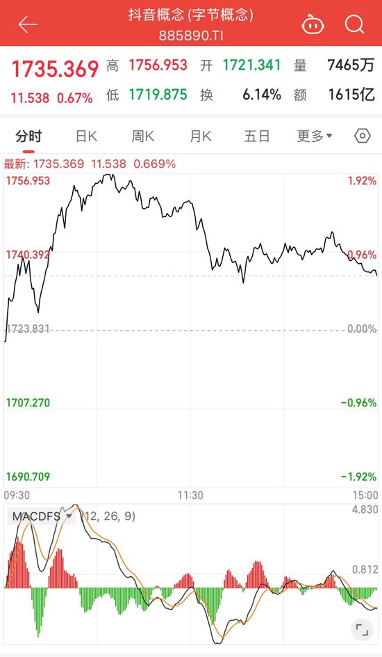 iFinD显示,9月25日上午抖音概念盘中拉升,涨幅一度逼近2%。随着相关辟谣信息的发布,抖音概念午后涨幅收窄。