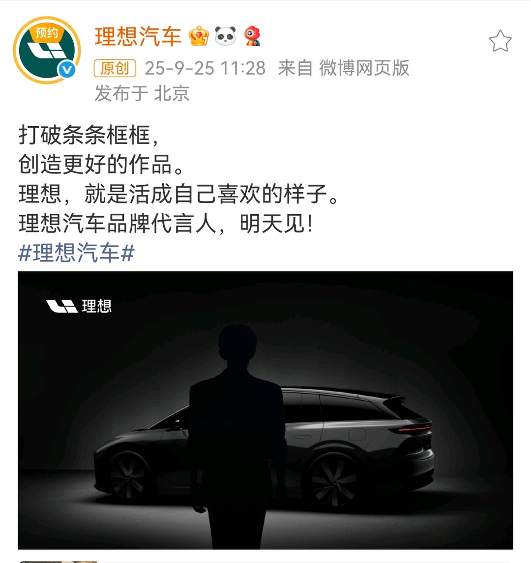 2025年9月25日,理想汽车官博发布一则神秘消息,配文“打破条条框框,创造更好的作品”,并附上一张代言人剪影与理想i6的合照。