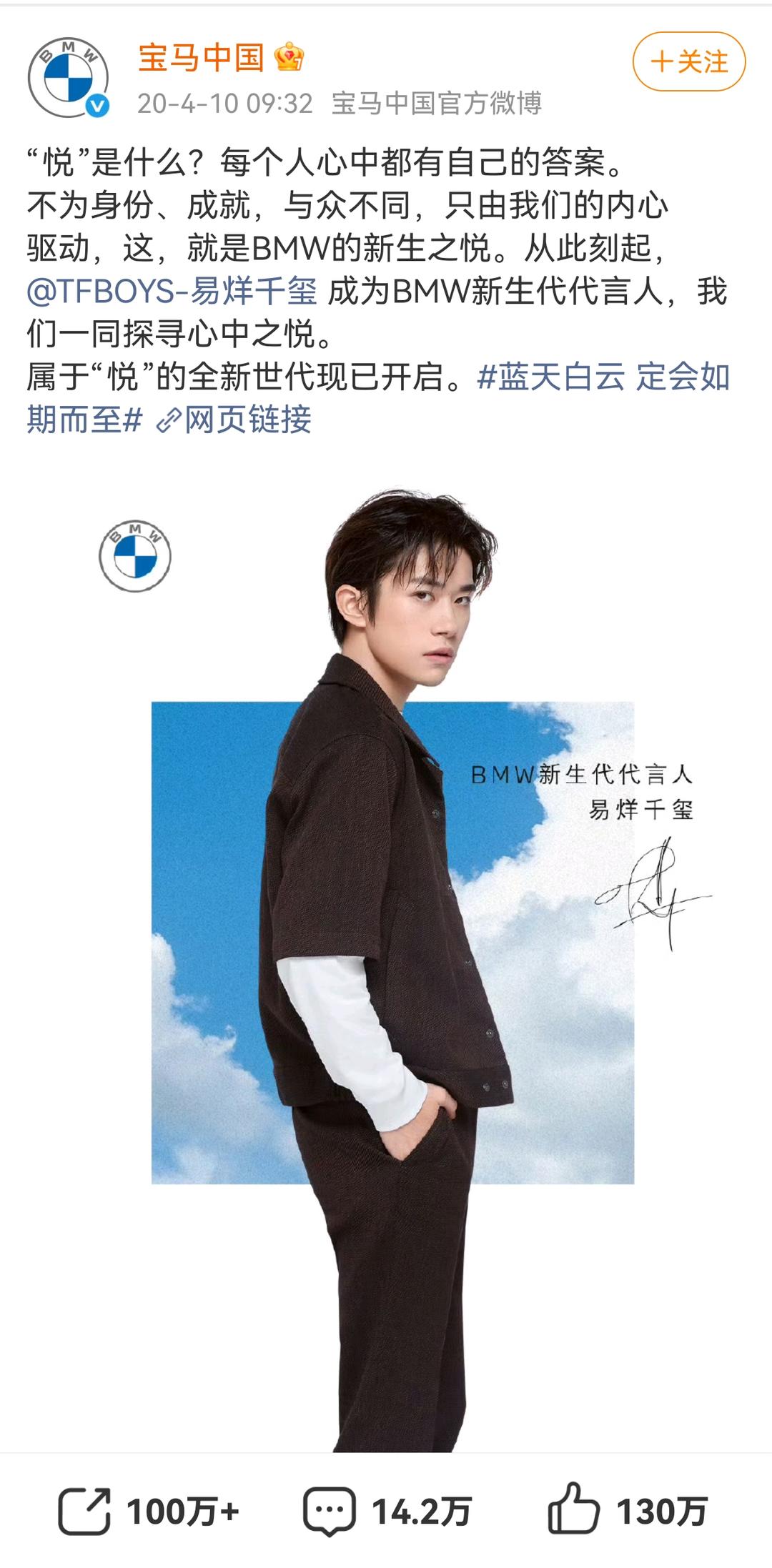 不过,易烊千玺的汽车代言效果已有前例。2020年,宝马宣布易烊千玺成为其新生代代言人,官宣微博收获超100万次转发,14万余条评论和130万余点赞。粉丝纷纷在评论区晒出自家宝马车型,形成现象级传播。此次代言理想,同样引发粉丝迅速行动。官宣消息发布后,已有粉丝晒出理想车型订单,证明顶流明星的“带货”能力。