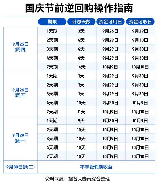 需要特别留心的是,9月30日作为节前最后一个交易日,此时参与逆回购无法享受假期收益,资金实际占款天数仅为7天却只能获得1天利息,故对投资者来说性价比可谓“大打折扣”。
