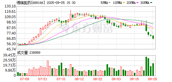 董事长拟提议回购背后,博瑞医药股价近期持续下跌。9月25日,博瑞医药收跌8.4%,收盘价为66.41元/股。9月22日至9月25日4个交易日间,博瑞医药股价累计下跌29.49%。