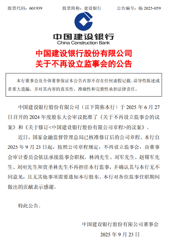 9月25日金融一线消息,公告,于2025 年6月27日召开的 2024 年度股东大会审议批准了《关于不再设立监事会的议案》和《关于修订<中国建设银行股份有限公司章程>的议案》。近日,国家金融监督管理总局已核准修订后的公司章程。本行自2025 年 9 月 23 日起,按照公司章程规定,不再设立监事会,由董事会审计委员会依法承接监事会职权,林鸿先生、刘军先生、赵锡军先生、刘桓先生和贲圣林先生不再担任本行监事,并确认其与本行无不同意见,且无其他事项需要通知本行股东。