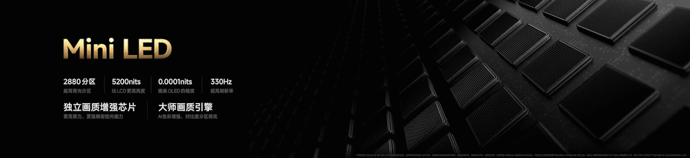画质上,采用高端的 Mini LED 技术,做到 2880 个超高背光分区、5200nits 超高峰值亮度,带来更强的视觉冲击力和层次表现。同时,配备独立画质增强芯片和大师画质引擎。软硬结合,整体画质十分出色。